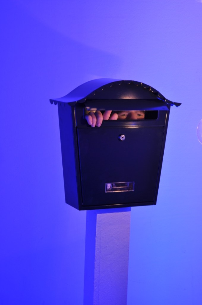 - A man bothered inside his own letterbox. It plays with the idea of confusion between « space and reality ».